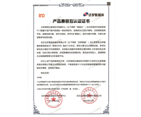 IP录音系统-达梦数据库产品兼容互认证书