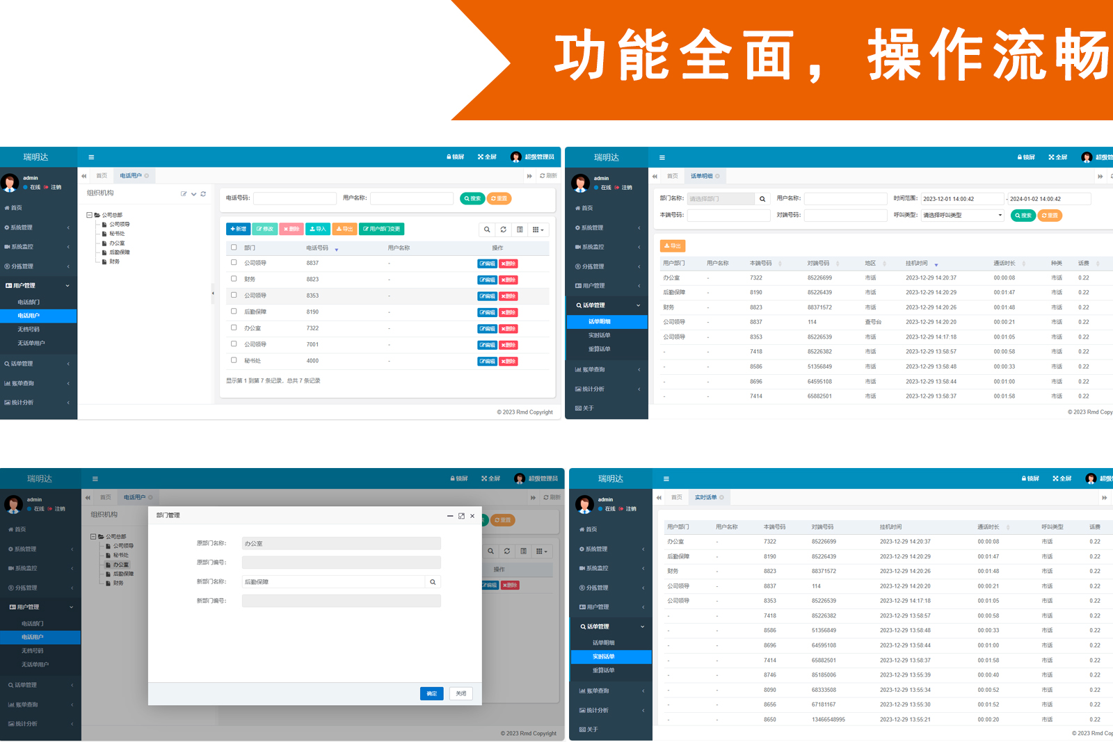 智能分级管理,权限准确控制:多层树形部门架构,分机属性灵活配置,国产OA无缝对接;